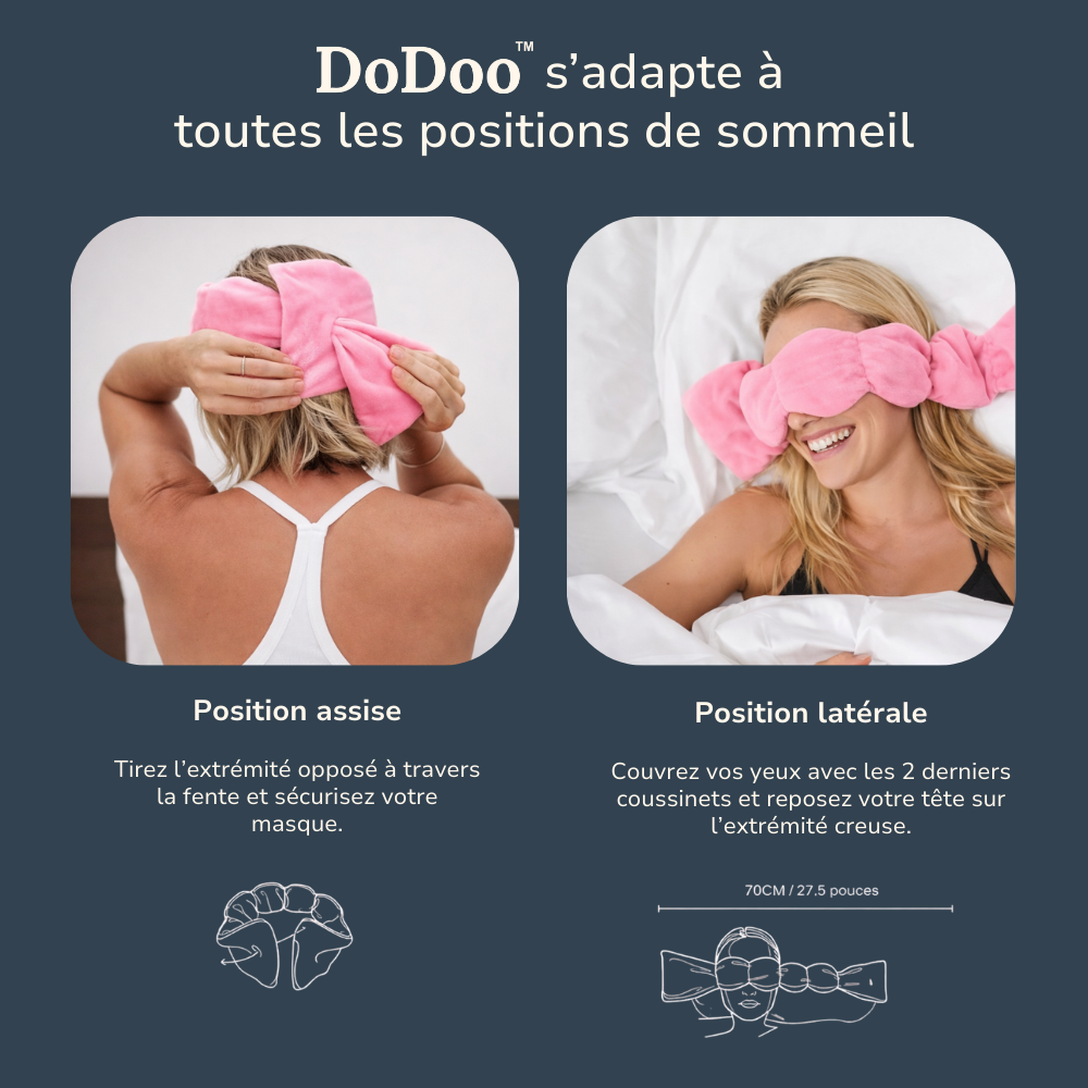 Rien ne vaut un DoDoo. Grâce à sa conception à 4 capsules, il exerce une pression douce et apaisante sur vos yeux et vos tempes. Sans sangles ni Velcro, il offre un confort moelleux et lesté qui reste en place quelle que soit votre position de sommeil. C'est l'expérience de sommeil originale et unique en son genre.